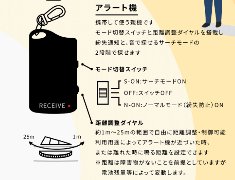 ①アラート機を「N-ON」にし、専用タグの電源をONにします