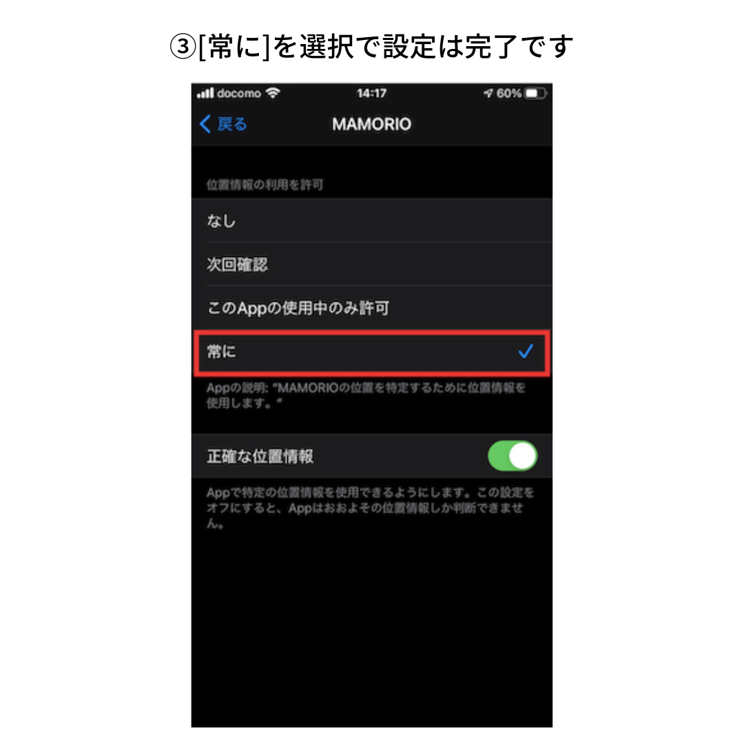 ②位置情報サービスをオンにしてMAMORIOをタップ